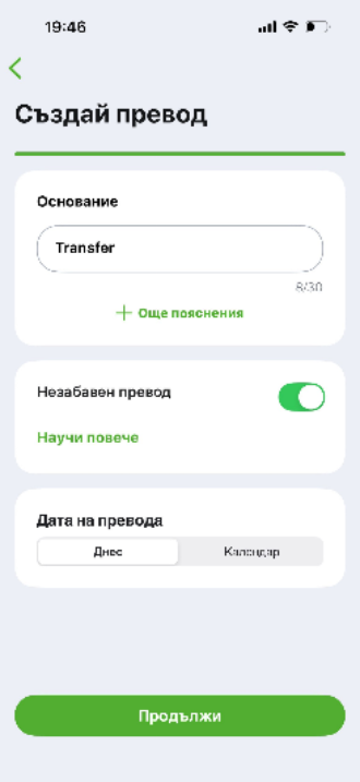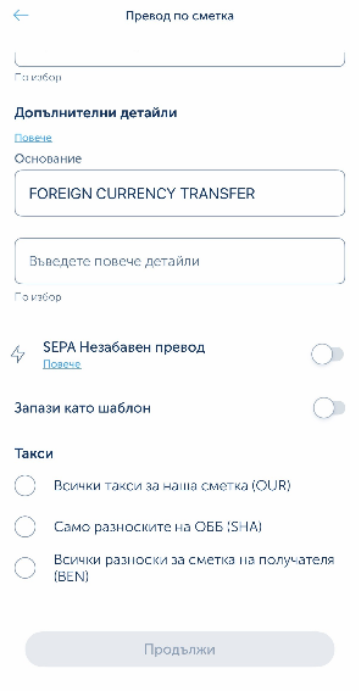| Вид превод | SEPA превод (или международен, ако SEPA не е наличен като отделна опция) |