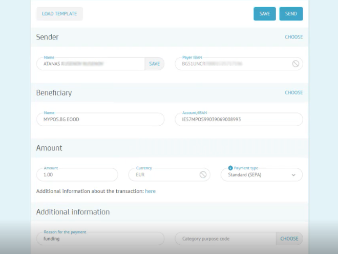 При изпращане на средства към myPOS сметка използвай следните данни:
