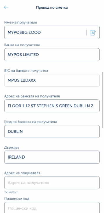 | Име на получателя | Получател с ирландски IBAN (напр. MYPOS.BG EOOD) |